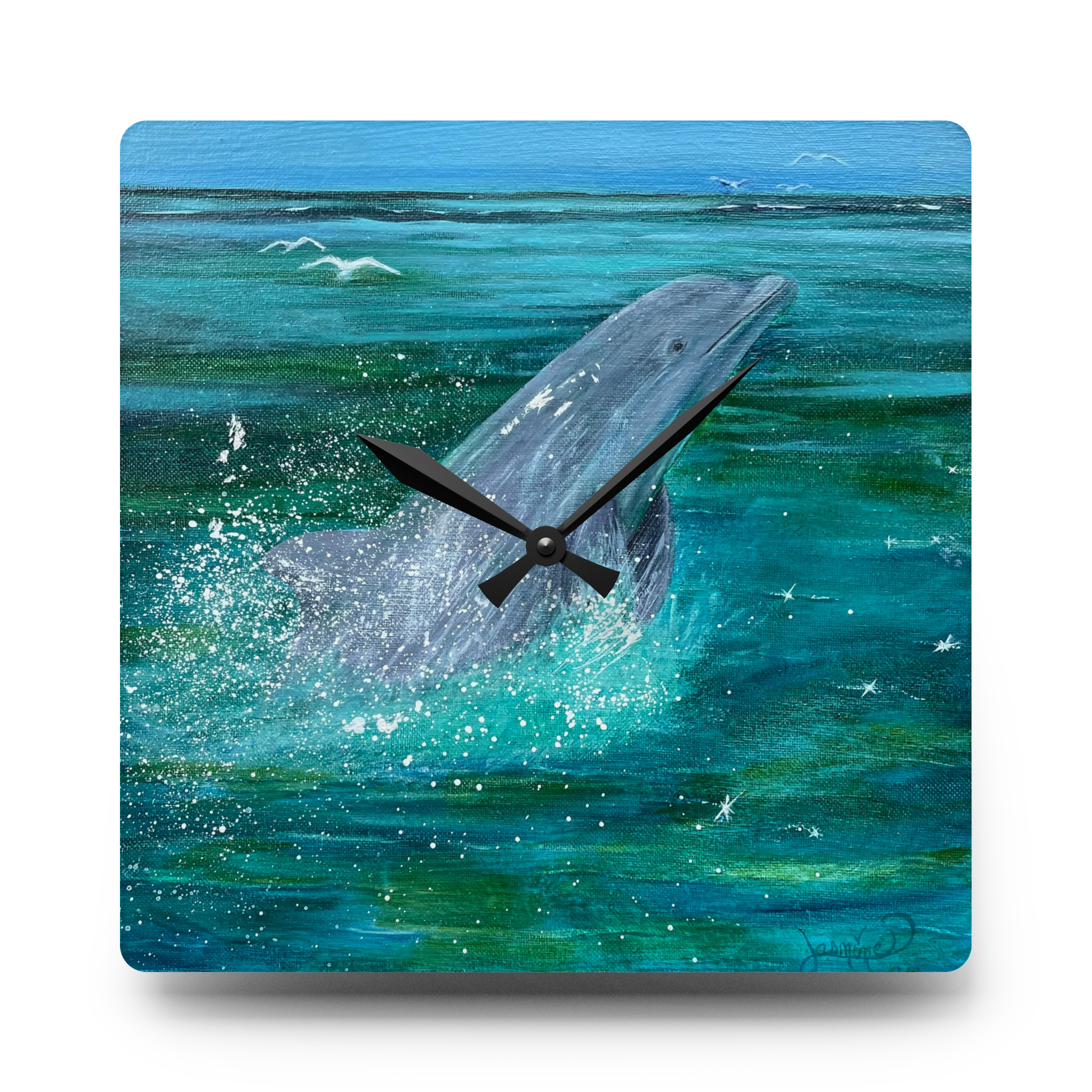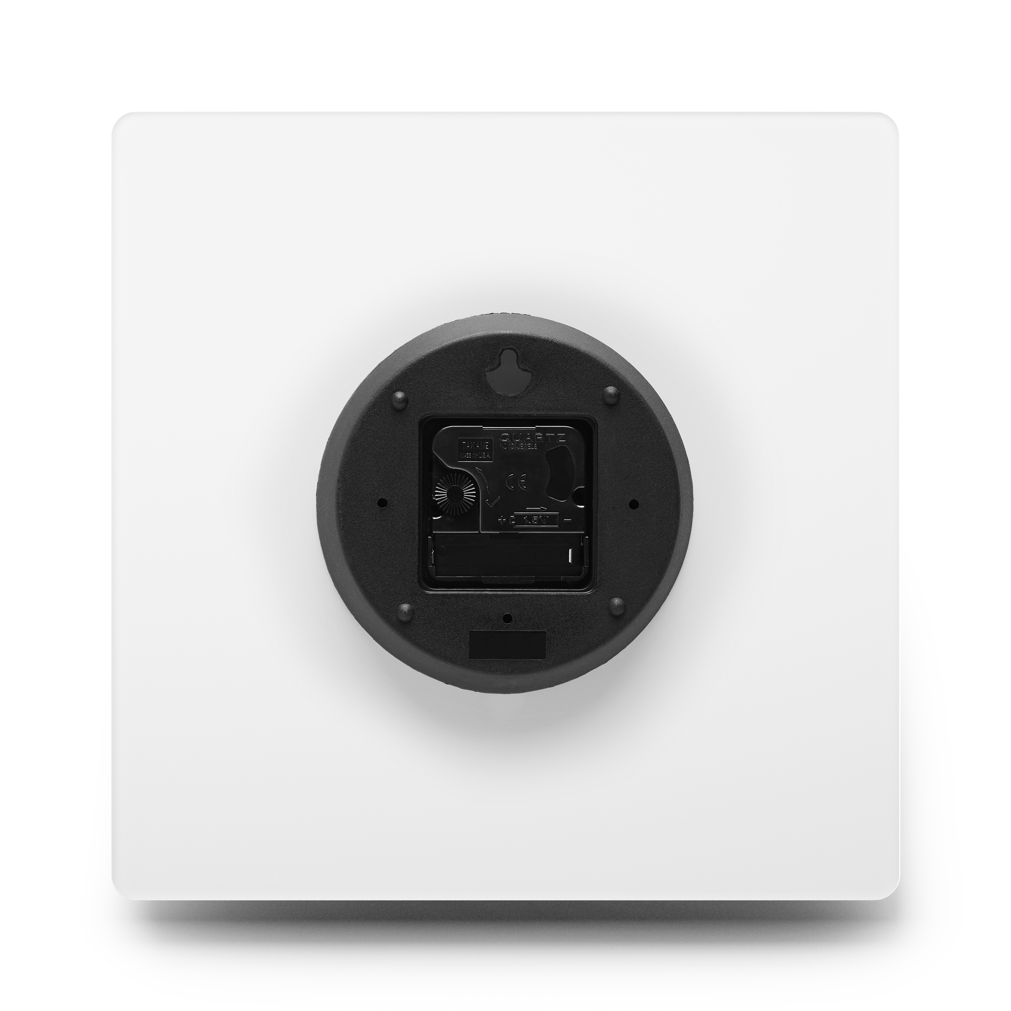 This clock come in a square shape. Each clock has a keyhole at the back for easy hanging on a wall. It is made from an acrylic material that looks like glass but is more durable and sturdy.